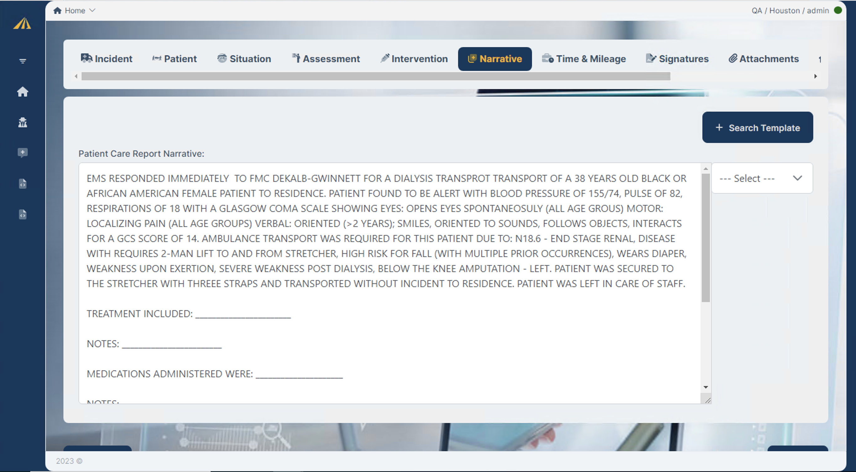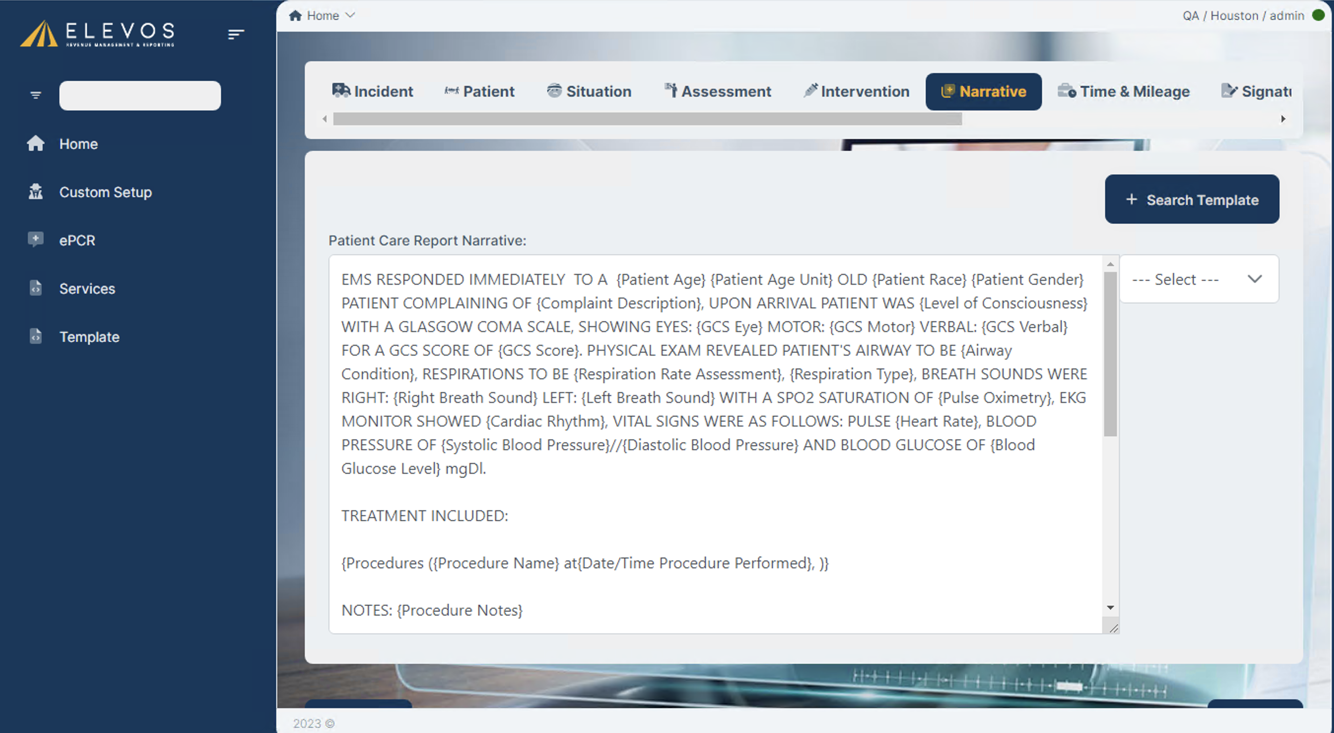 To access narrative templates, you'll have to go to the ePCR tab → access the Narrative, and select “Search Template”, for this specific template you'd need to select the “Medical Emergency” template.