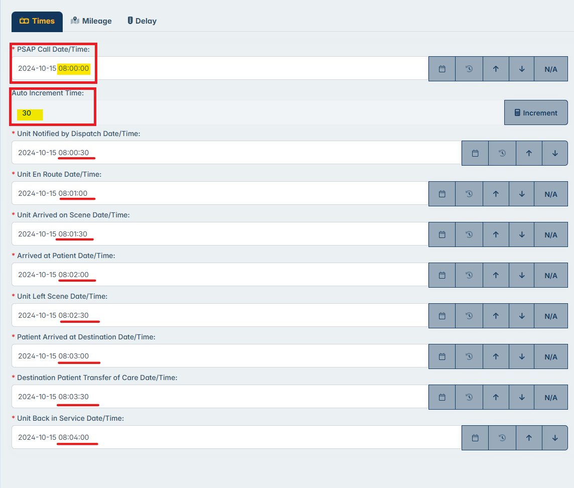 All mandatory time fields will be automatically increased by the configured increment value. (Fields marked with a red asterisk)